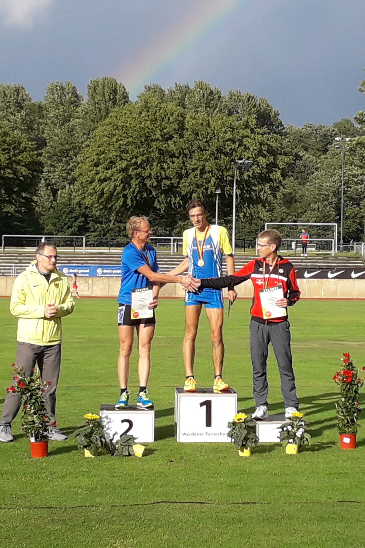 Nach der Ziellinie konnte ich noch stehen, habe mich nicht vollkommen verausgabt. Gleich kommen die Gespräche über Alter und Rennverlauf. Das Bangen, ob es wenigstens zur Bronzemedaille gereicht hat, bewegt mich doch sehr. Ich bin sogar noch in der Lage, etwas auszulaufen. Knie und Lunge haben tadellos mitgearbeitet. Jetzt mache ich mich erst mal frisch, ziehe ein trockenes Blau-Weiß-Bürgel-Shirt über und schaue zur Ergebnisliste. Da finde ich mich doch tatsächlich auf dem 2. Platz wieder! Ich hätte vor Freude Luftsprünge machen können. Bis zur Siegerehrung verdöse ich die Zeit, genieße den Erfolg. Immerhin war es meine zweitbeste 10-km-Leistung überhaupt. Nie hätte ich daran geglaubt, so etwas zu erleben.
